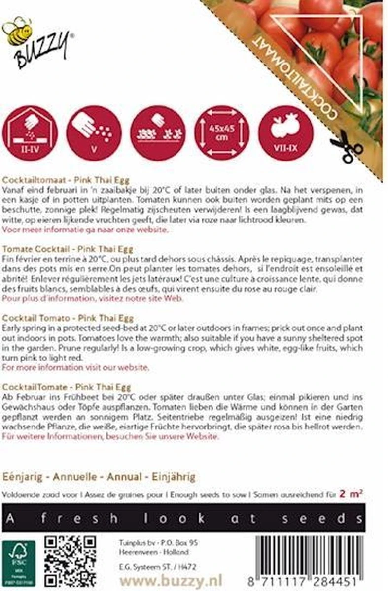 Tomaat Uovo Roseo is een laagblijvend gewas, dat witte, op eieren lijkende vruchten geeft, die later via roze naar lichtrood kleuren.Vanaf eind februari in ‘n zaaibakje bij 20°C of later buiten onder glas. Na het verspenen, in een kasje of in potten uitplanten.