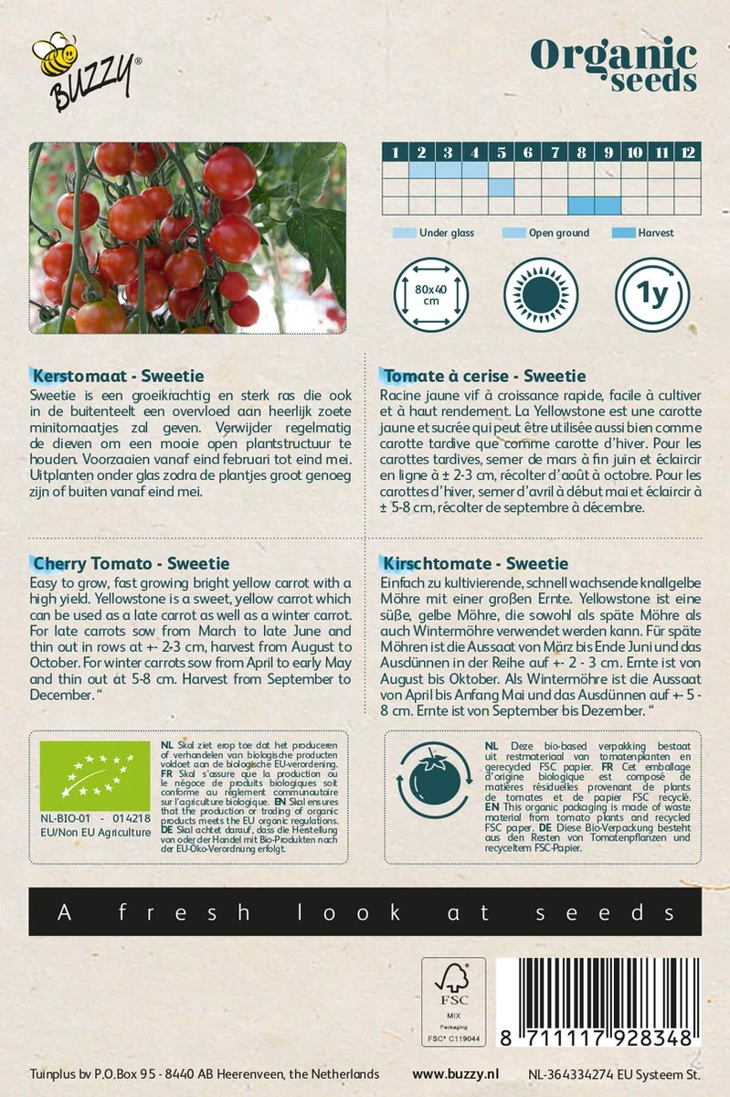 Sweetie is een groeikrachtig en sterk ras die ook in de buitenteelt een overvloed aan heerlijk zoete minitomaatjes zal geven. Verwijder regelmatig de dieven om een mooie open plantstructuur te houden. Voorzaaien vanaf eind februari tot eind mei. Uitplanten onder glas zodra de plantjes groot genoeg zijn of buiten vanaf eind mei.