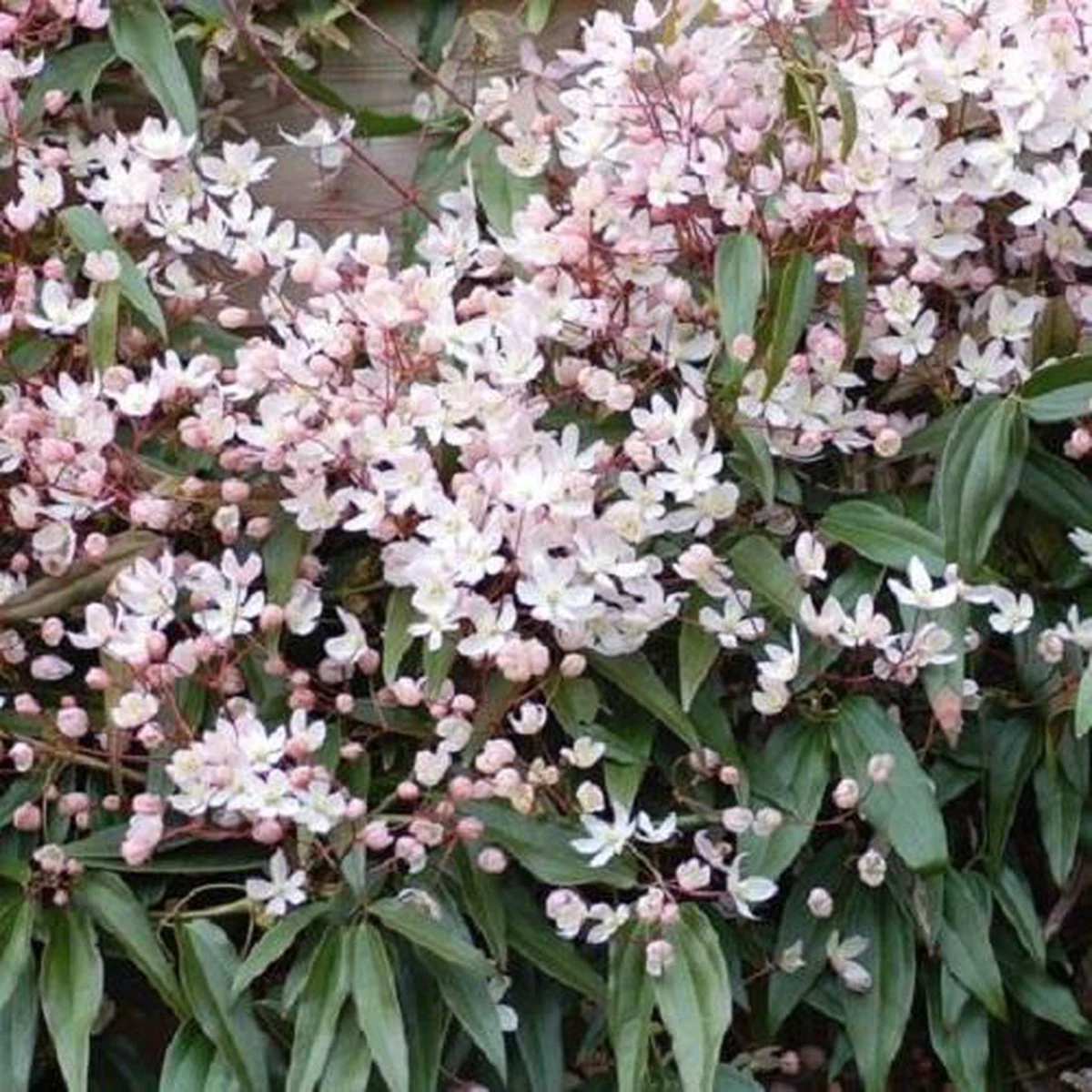 Bloemkleur: wit/licht roze (blad blijft in de winter groen)
