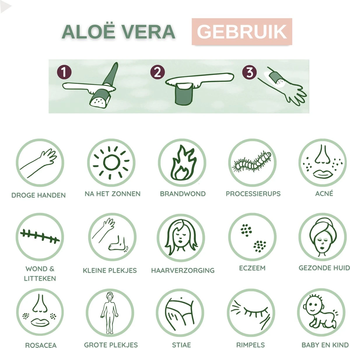 Je kan ook van deze plant een blad afsnijden om de Aloë vera gel te gebruiken voor jouw huidverzorging. Pure schoonheid komt van binnenuit. Wil je je mooie plant liever heel houden… kies dan voor onze losse Aloë vera bladeren. Als jouw bestelling binnenkomt gaan wij de kwekerij in en snijden ze vers voor je af.