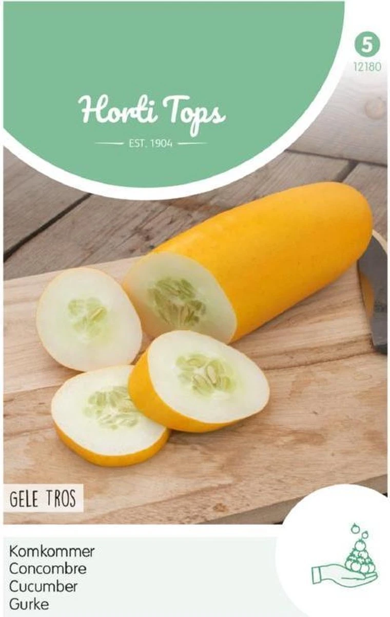 Half april-mei onder glas, verspenen in potjes en half mei buiten uitplanten, of vanaf mei buien in regels zaaien. Gele Tros is de naam van een oud ras, dat het in de vollegrond prima doet. De smaak van deze gele komkommer is wat sterker, bovendien is hij minder waterig.
