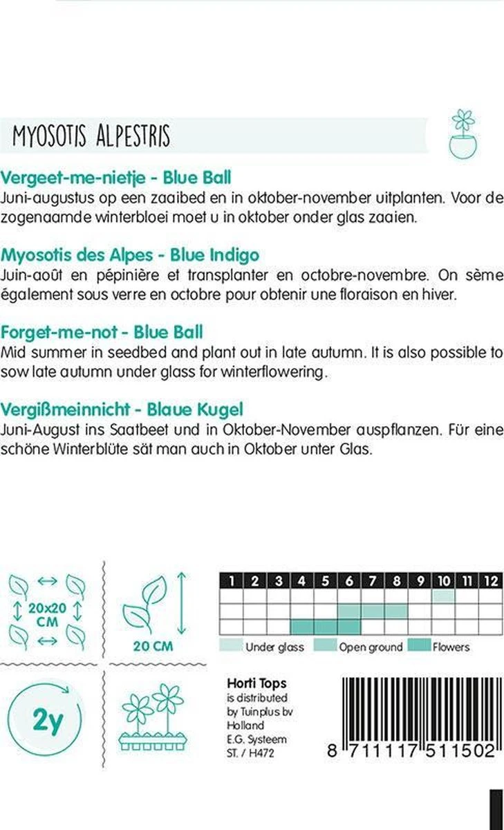 Zaai Vergeet-me-nietjes in juni-augustus op een zaaibed en in oktober-november uitplanten. Voor de zogenaamde winterbloei moet je in oktober onder glas zaaien.