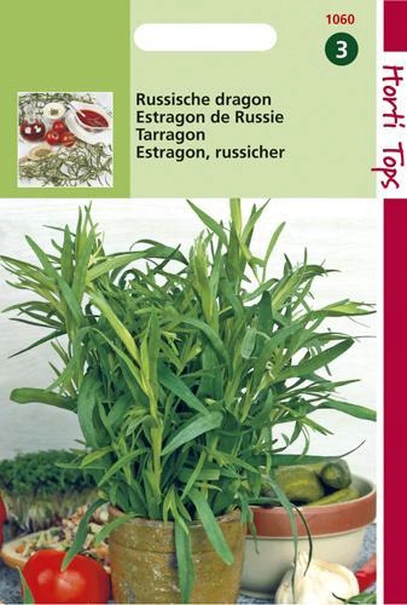 Russische Dragon. Vanaf maart t/m april zaaien in een kweekbakje of van april t/m juni buiten op een zaaibed; één keer verspenen en vervolgens uitplanten. Gebruik: vers of gedroogd bij vis, gevogelte, soep en bij de inmaak van augurken; probeer eens vis met veel dragon in folie te grillen.