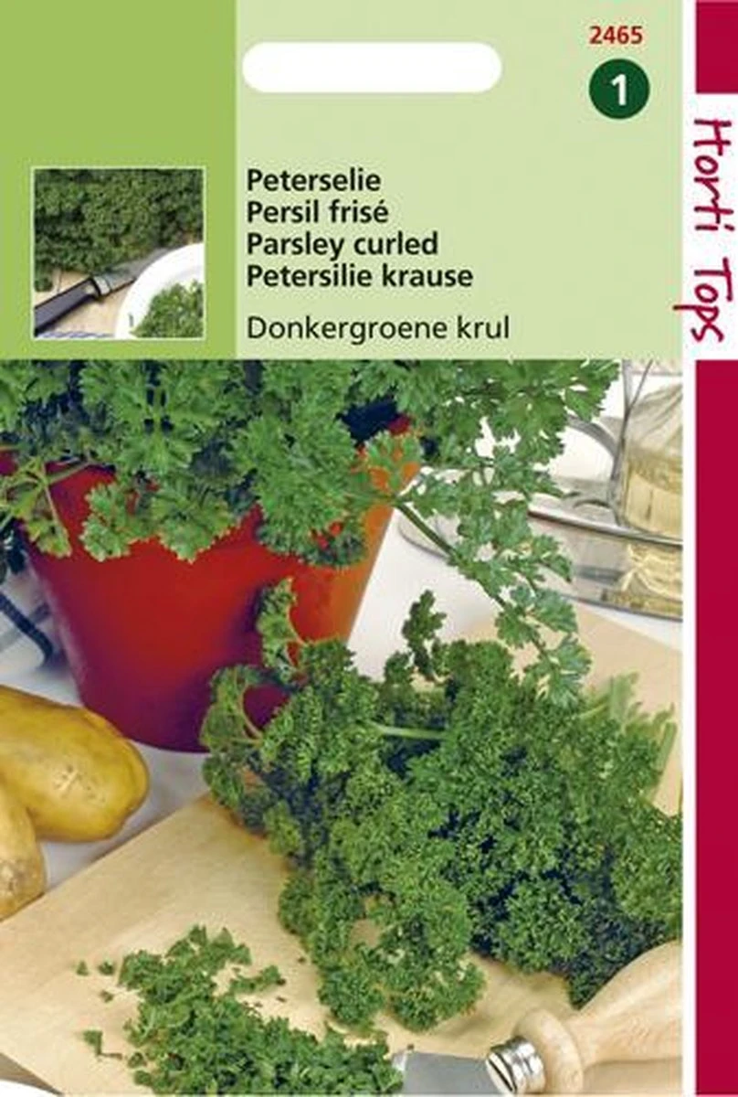 Peterselie – donkergroene krul. Vanaf half februari tot half maart zaaien onder glas of vanaf half maart tot begin augustus in de volle grond. Als men de zaden een nacht voor het zaaien in water laat weken, zal het ontkiemen sneller gaan.