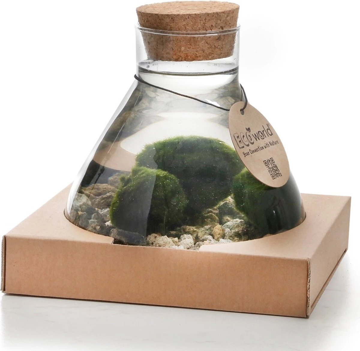 BEVAT: Model Piramide – 100% gerecycled glas (H=20cm | Ø bodem=16.5cm ), Afsluit kurk, 3 Marimo Mosballen, Excellent Substraat en DIY Stappen-plan instructie