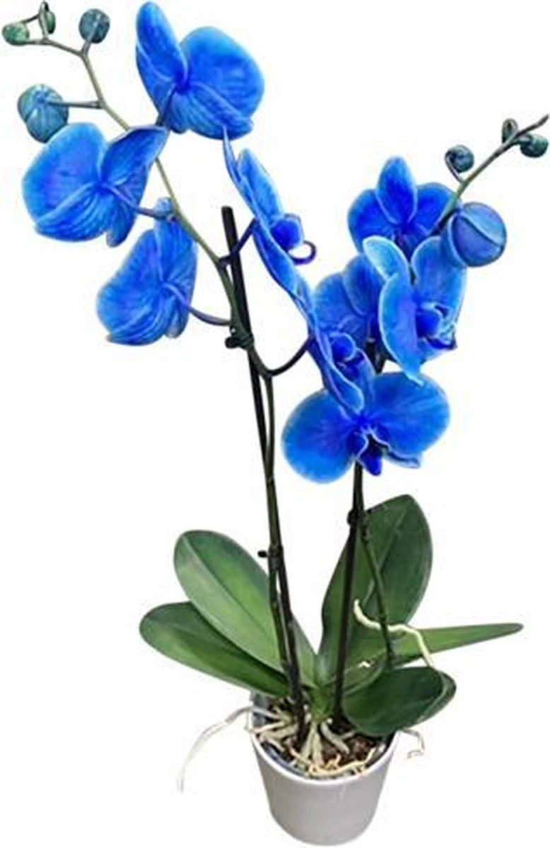 Prachtige Phalaenopsis plant in blauwe kleuren inclusief witte keramiek pot. De stelen van deze phalaenopsis zijn geinjecteerd met blauwe kleurstof om deze aparte kleuren te krijgen.