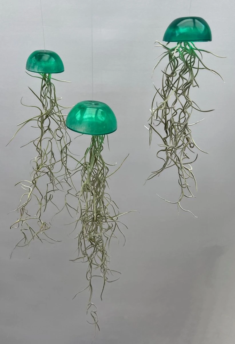 Set van drie glazige Jellyfish luchtplanten met een mooi gekleurd groen lijfje en Spaans mos.