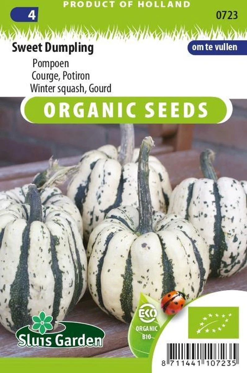 Deze opvallende pompoen is niet alleen zeer decoratief, maar ook bijzonder smaakvol. De smaak van het oranje/gele vruchtvlees is heerlijk zoet en licht kastanjeachtig. De plant draagt gemiddeld 10 kleine vruchten van ca. 8 – 12 cm groot. De crèmewitte kleur doet het prima met de contrasterende donkergroene strepen die langs de groeven lopen. Sweet Dumpling is op z’n best tot 4 maanden na de oogst. In het begin zelfs als een “mangetout” eetbaar, dus met buitenkant en al. Uitstekend geschikt om te vullen.