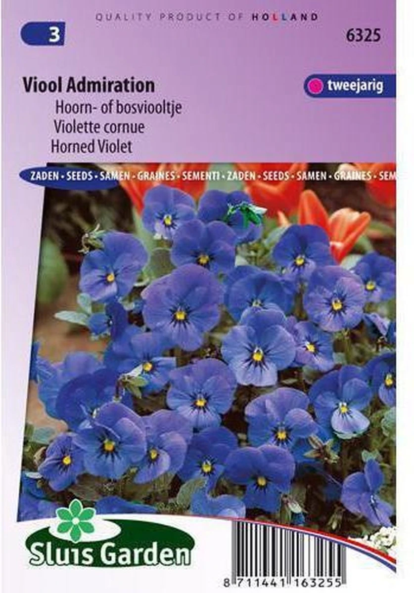 Het hoornviooltje met grootbloemige donkerblauwe, ronde bloemen. De bloemen van de viooltjes zijn eetbaar. In principe zijn alle viooltjes tweejarig, maar de eenjarige cultuur is aan te raden. Vroeg in het voorjaar zaaien, eventueel onder koud glas, verspenen of direct van het plantbed uitplanten op plaats van bestemming. Geel gearceerd is tweejarige teelt.Afvulgewicht: 0,15 gr. Aantal zaden: ca. 135. Kiemduur: ca. 15 dagen. Zaaitemperatuur ca. 16ºC Groeihoogte:15 cm. Zaaiafstand: 15cm. Zaaidiepte: 0,5cm. Plantplaats: Halfzon.