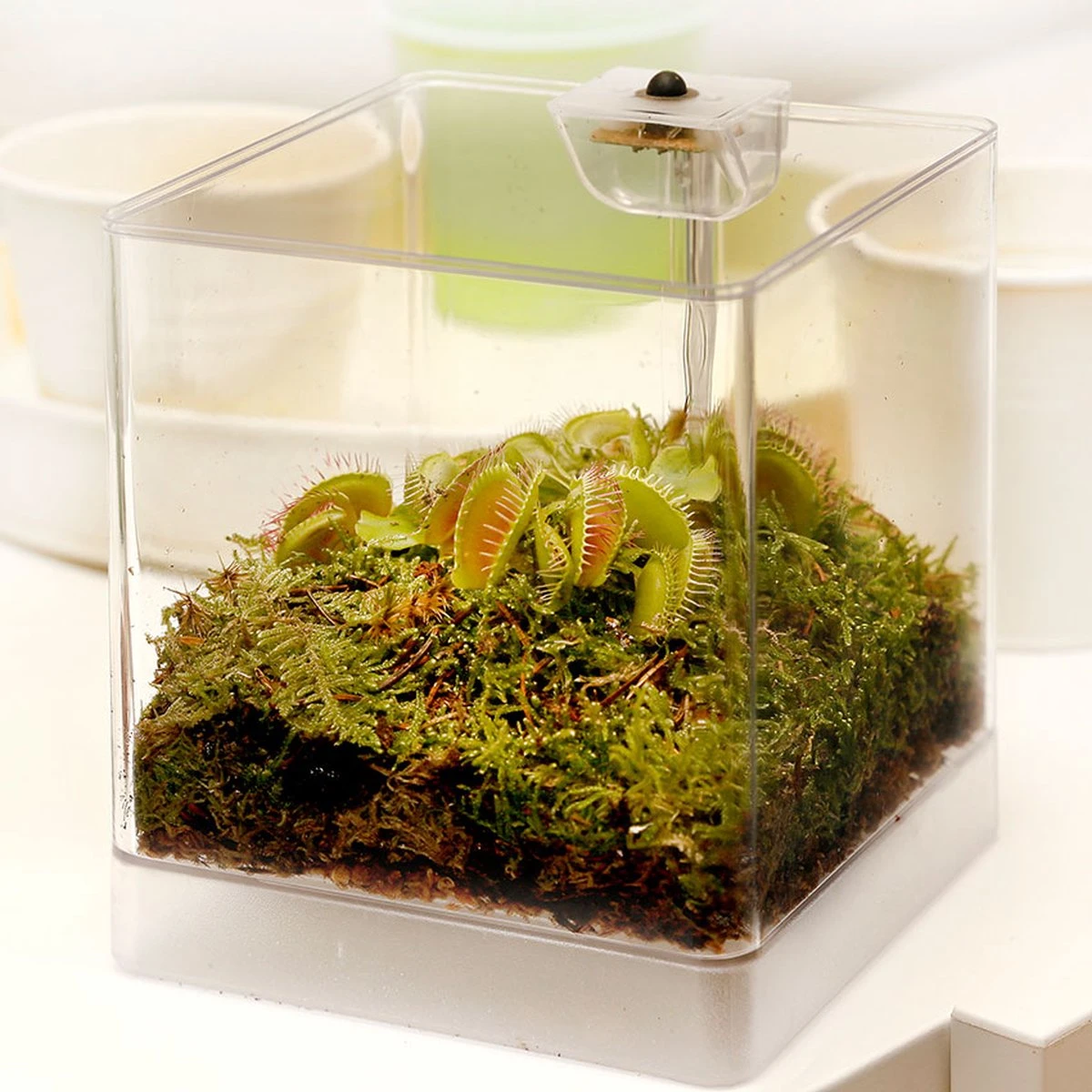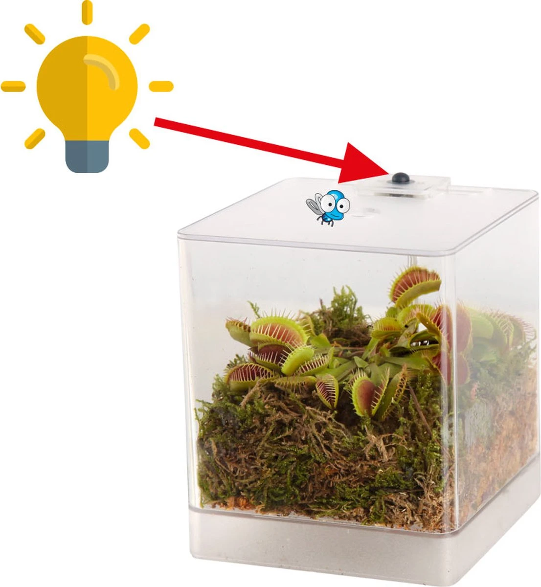 Een compleet mini terrarium, geleverd met een vleesetende plant, grond, groen mos, watermeter én Swampworld Rain Drops. Het terrarium wordt geleverd met de Dionaea Muscipula, ook wel de Venus Vliegenval. Een bijzonder fascinerende moerasplant. Met zijn prachtige blaadjes vangt hij insecten, die hij vervolgens verteert. De blaadjes van de Venus Vliegenval lijken op bekjes met scherpe tandjes. De binnenkant van de bladeren is rood en voorzien van haartjes. Zodra er twee keer een haartje wordt aangeraakt, klapt de val dicht. Een slimme constructie, want door dit pas na de tweede aanraking te doen, klapt de val niet voor niets dicht als er bijvoorbeeld een blaadje of regendruppel op valt. Zodra de val volledig gesloten is, scheidt de plant een vloeistof uit met enzymen die de insecten verteren. De Venus Vliegenval staat het liefst met natte voeten in de grond. Je ontvangt bij dit terrarium een watermeter om dit in de gaten te houden. Ook een flesje Rain Drops, 100 % ongezuiverd regenwater mag niet ontbreken. In kraanwater zitten allerlei mineralen uit de bodem. Deze mineralen maken van kraanwater, hard water en is niet goed voor de groei van vleesetende planten. Om uw vleesetende plant optimaal te laten groeien is het belangrijk om het juiste water toe te passen. Swampworld Raindrops is 100% ongezuiverd regenwater. Het is dé perfecte waterbron voor een optimale groei en bloei van uw vleesetende planten! De Venus Vliegenval voelt zich het meest thuis op een lichte plek, uit het directe zonlicht. Het LED lampje trekt insecten aan, die vervolgens grote kans maken in de val te belanden van de vleesetende plant. De verlichting werkt op vier AA batterijen (niet meegeleverd). Het terrarium, de vleesetende plant , grond, mos, watermeter en Rain Drops worden apart en zorgvuldig verpakt en geleverd. Het terrarium kan na levering geheel naar uw eigen smaak worden ingericht.