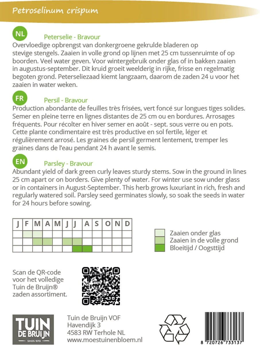 Overvloedige opbrengst van donkergroene gekrulde bladeren op stevige stengels. Zaaien in volle grond op lijnen met 25 cm tussenruimte of op boorden. Veel water geven. Voor winter gebruik onder glas of in bakken zaaien in augustus -september. Dit kruid groeit weelderig in rijke, frisse en regelmatig begoten grond. Peterseliezaad kiemt langzaam, daarom de zaden 24 u voor het zaaien in water weken.